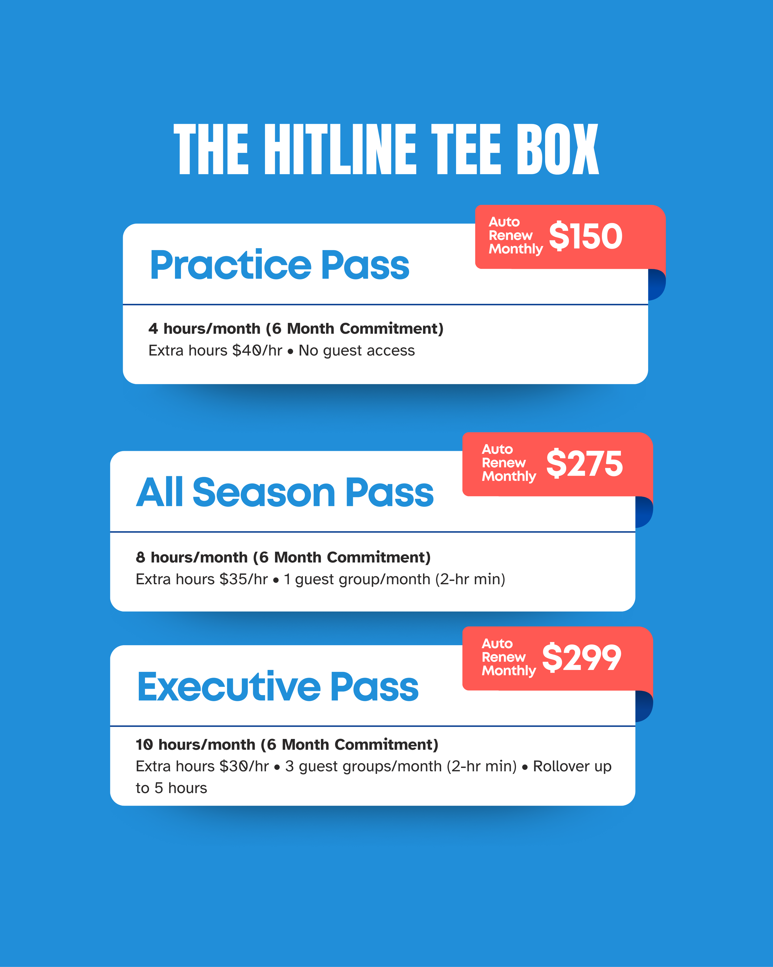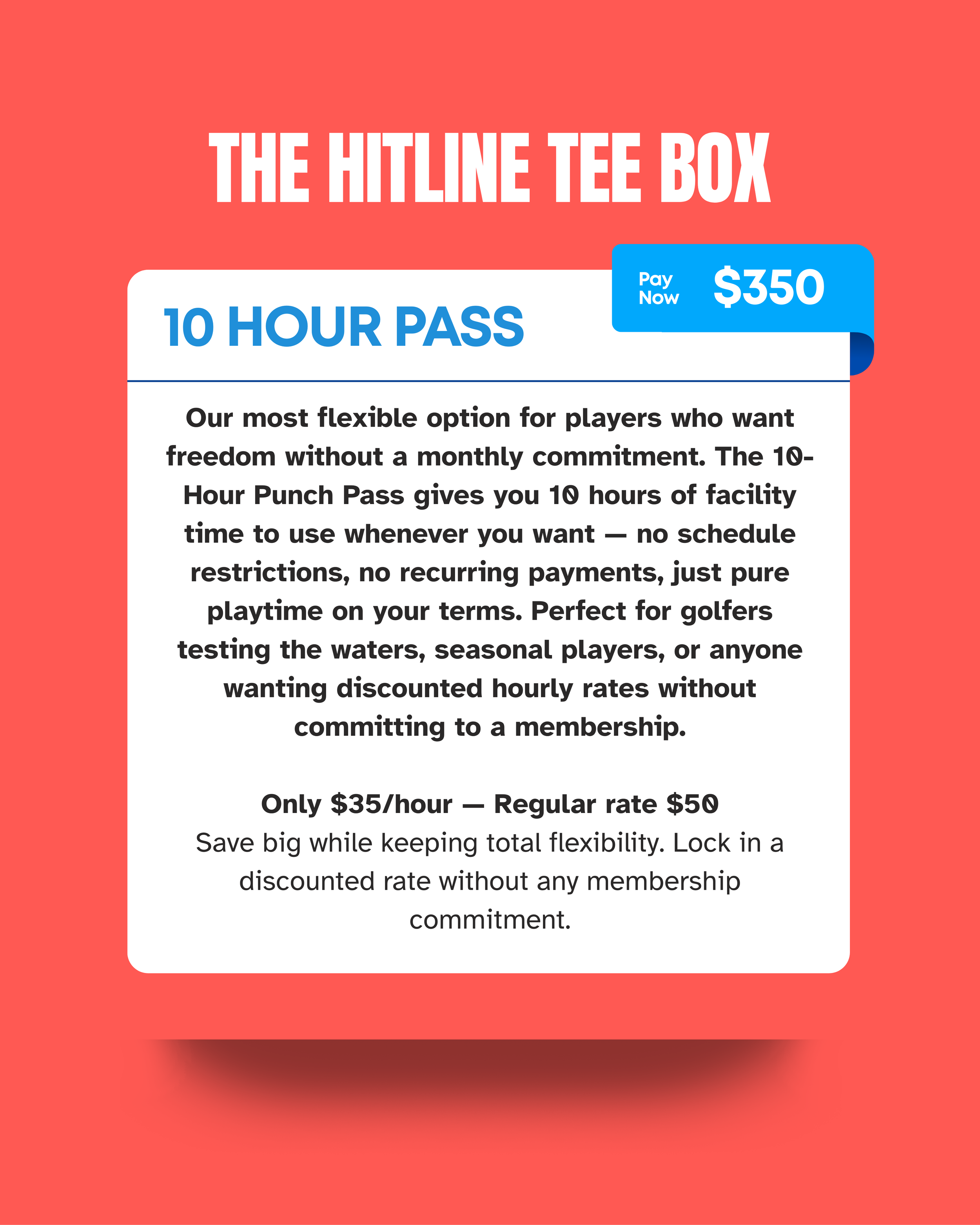 Our most flexible option for players who want freedom without a monthly commitment. The 10-Hour Punch Pass gives you 10 hours of facility time to use whenever you want — no schedule restrictions, no recurring payments, just pure playtime on your terms. Perfect for golfers testing the waters, seasonal players, or anyone wanting discounted hourly rates without committing to a membership.